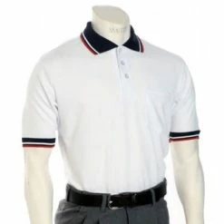 This is the white umpire shirt umpires wear, mostly for softball. It has white/navy/red trim and is made by Smitty. It is pro-knit for professional performance, durability and comfort.