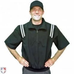 This is the traditional black half-zip short sleeve baseball and softball umpire jacket (pullover) made for cool weather with traditional white shoulder stripes.