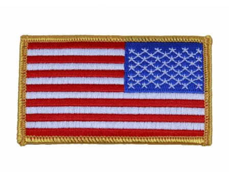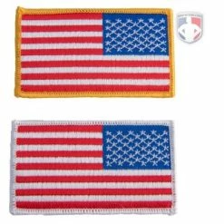 Embroidered United States flag patch for referee or umpire uniforms – generally for use on right sleeve- is 3.5″ by 2.25″. Choose American flag with white or gold border.
